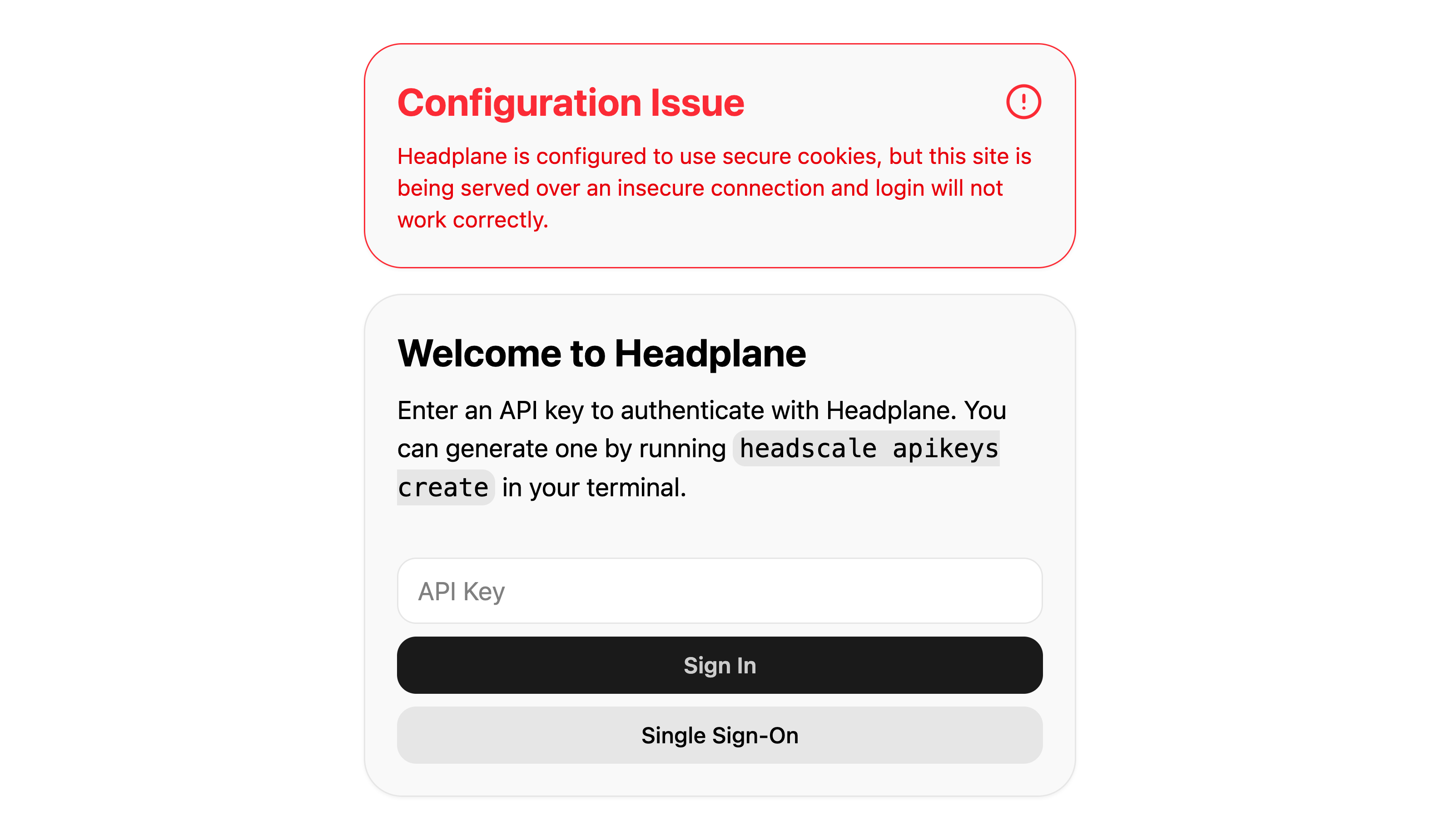 Headplane tries to detect misconfigurations and will surface a warning banner on the login page if it detects any abnormalities. You may see a banner like this: