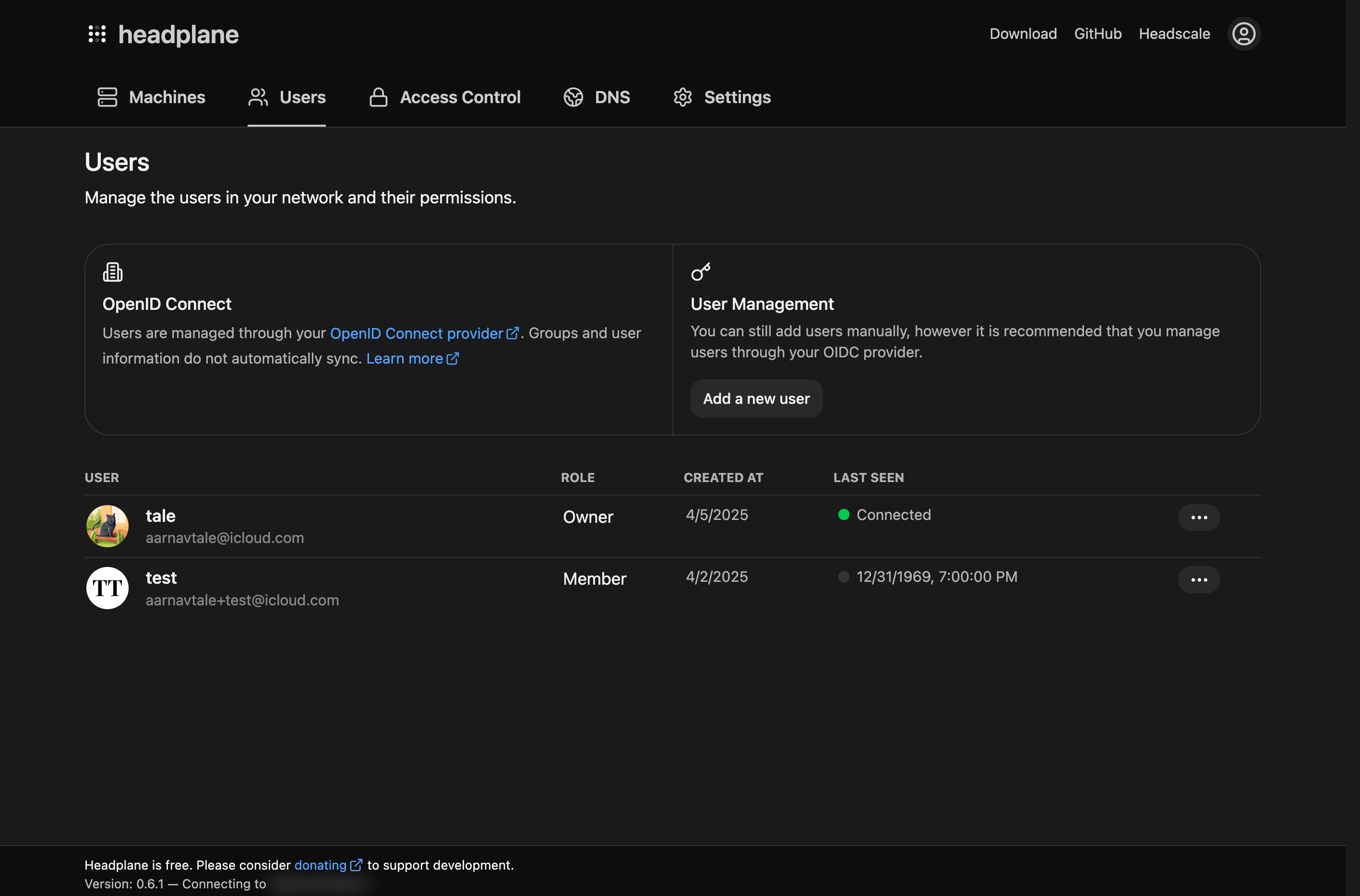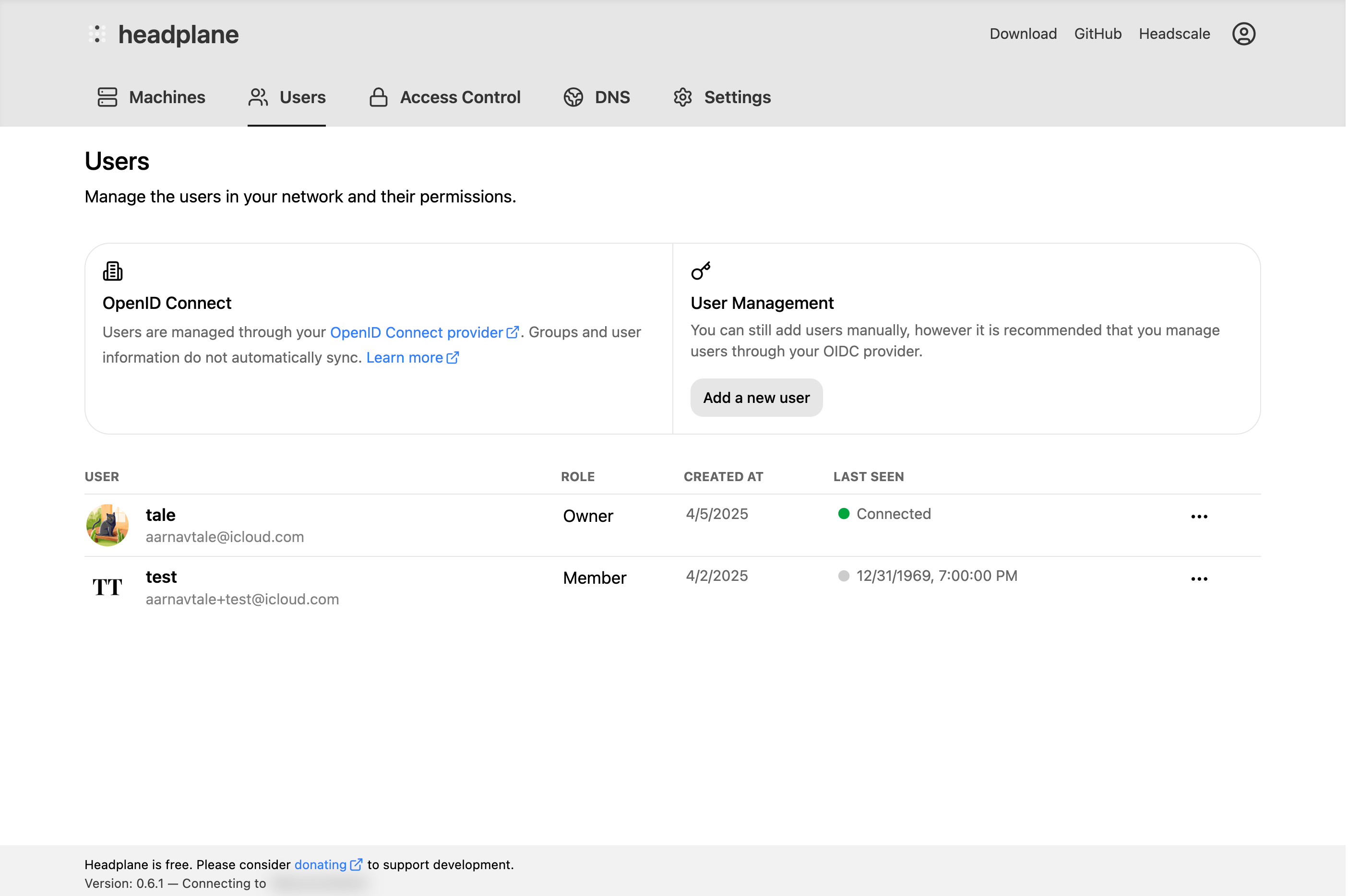 provider_idfor each OIDC user (e.g.https://idp.example.com/3d6f6e3f-...). Headplane extracts the last path segment and compares it to thesubclaim from the OIDC token. If they match, the user is linked.Email match (fallback): If the subject doesn't match, Headplane falls back to comparing the user's email address from the OIDC